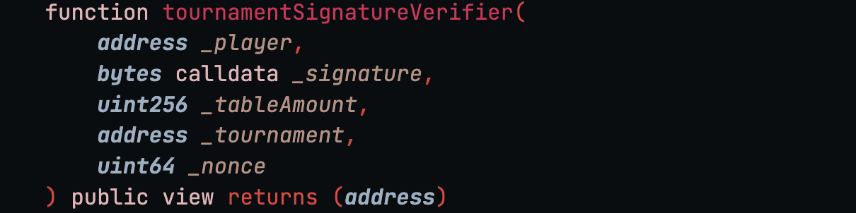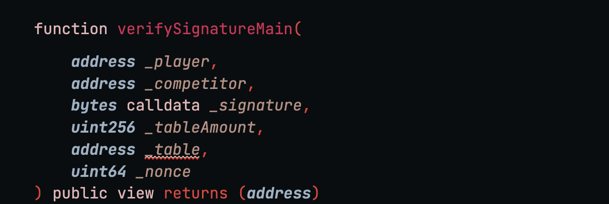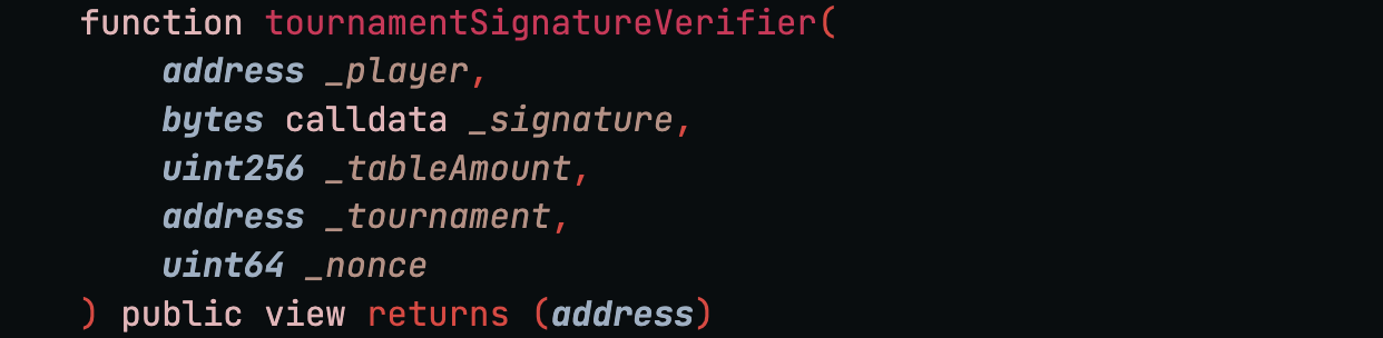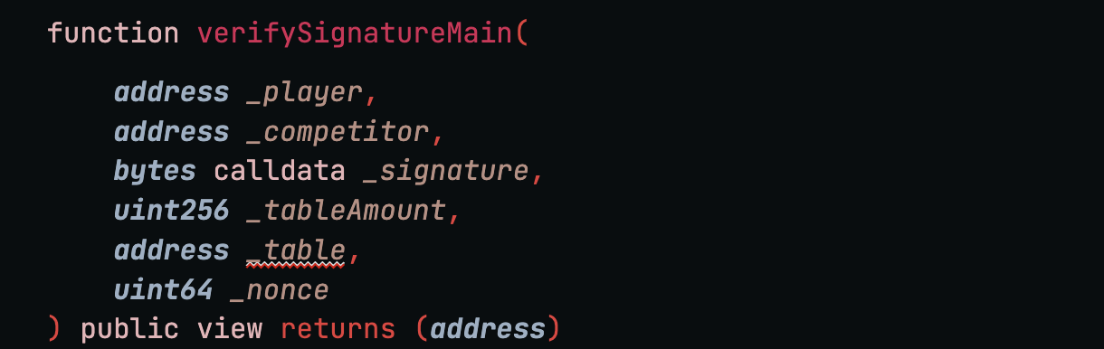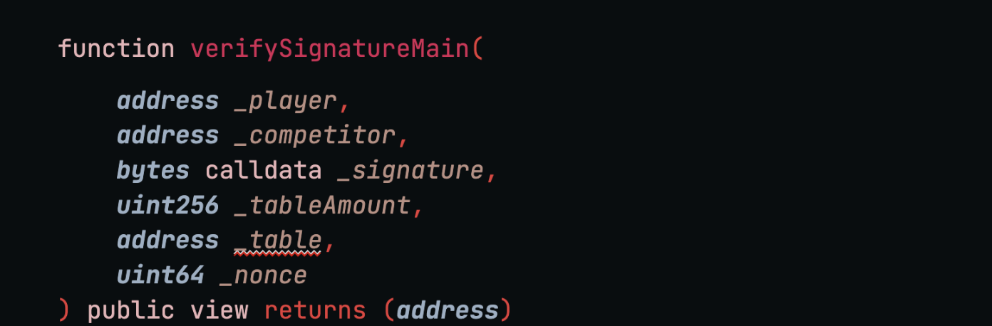 Once this data is signed, the player submits the generated signature to Palgam’s backend service. The smart contract then verifies each player’s signature using the function described above. It’s important to note that signatures are valid only once and have a maximum expiration time of 2.78 hours. After expiration, a signature becomes invalid. Additionally, each signature can be used for only one game and is marked as used in the signature history.