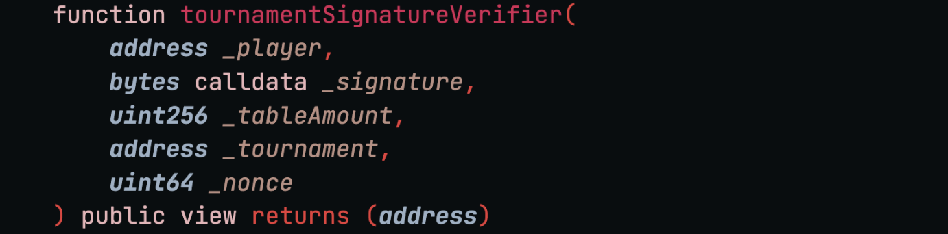 The process of entering the tournaments begins with selecting an available(open) tournament table. Each player is provided with the table's nonce, and the tournament’s table smart contract address. Players must then sign a combination of these details, along with the tournament entrance amount and a deadline: